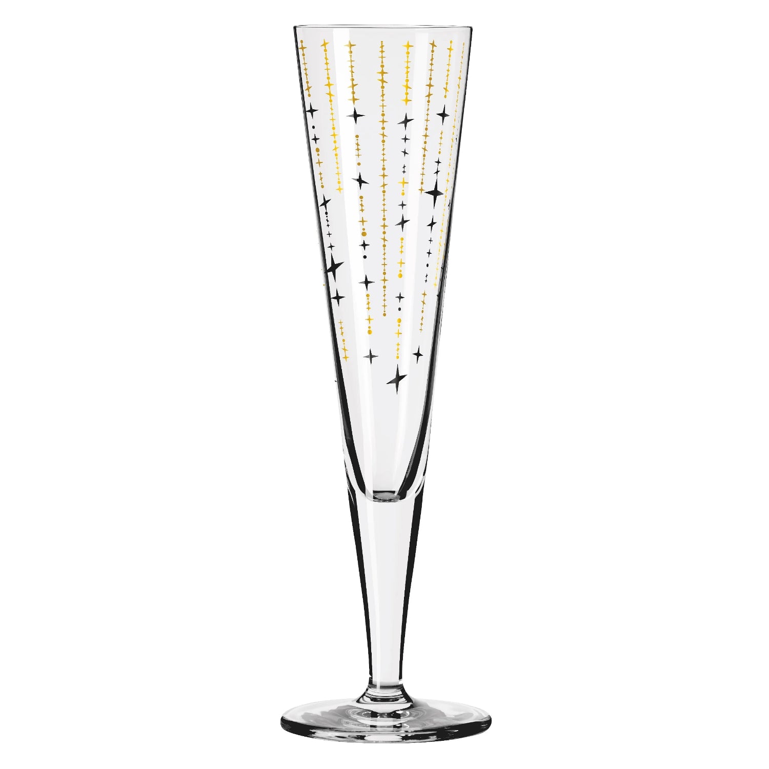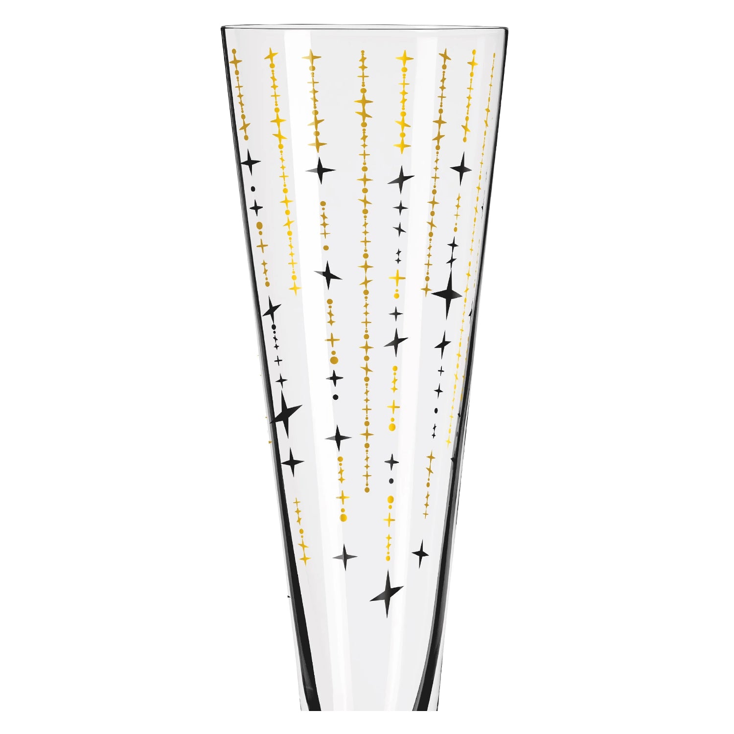 Schönheit des Nachthimmels: In ihrem eiligen Tanz umhüllen schwarze und goldene Sterne das Champagnerglas. Ein Dekor aus purem Luxus und unwiderstehlicher Eleganz, das jeden Moment einen Hauch von Glanz verleiht!