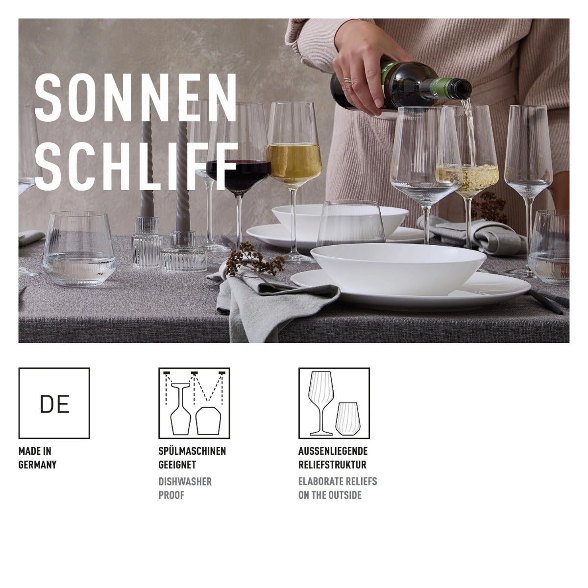 Sonnenschliff – Klare Formsprache, fein im Detail: Die Gläser sind mit einer filigranen, außenliegenden Reliefstruktur aufwendig gearbeitet und lassen ein strahlendes Wechselspiel von Licht und Schatten entstehen. Die eleganten Sonnenschliff‐Sets verleihen jedem Anlass einen anspruchsvollen Stil und kreieren einen perfekt abgestimmten Look!